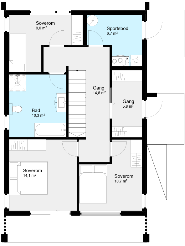 Hovedsoverommet i andre etasje er en egen avdeling i huset. Her har du egen stue, store vindusflater og mye lys og utsikt. Vi viser bare én løsning – her er det mange måter å gjøre det på. Hvordan ser din Braga ut?