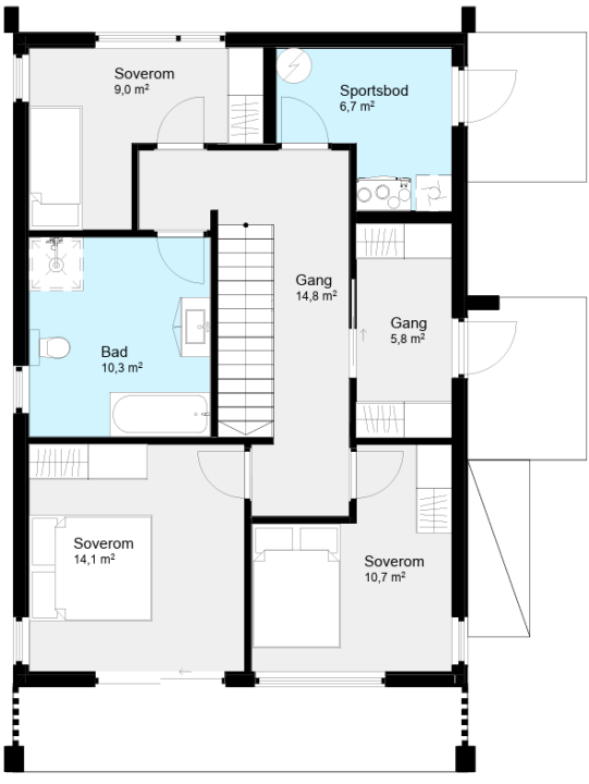 Hovedsoverommet i andre etasje er en egen avdeling i huset. Her har du egen stue, store vindusflater og mye lys og utsikt. Vi viser bare én løsning – her er det mange måter å gjøre det på. Hvordan ser din Braga ut?